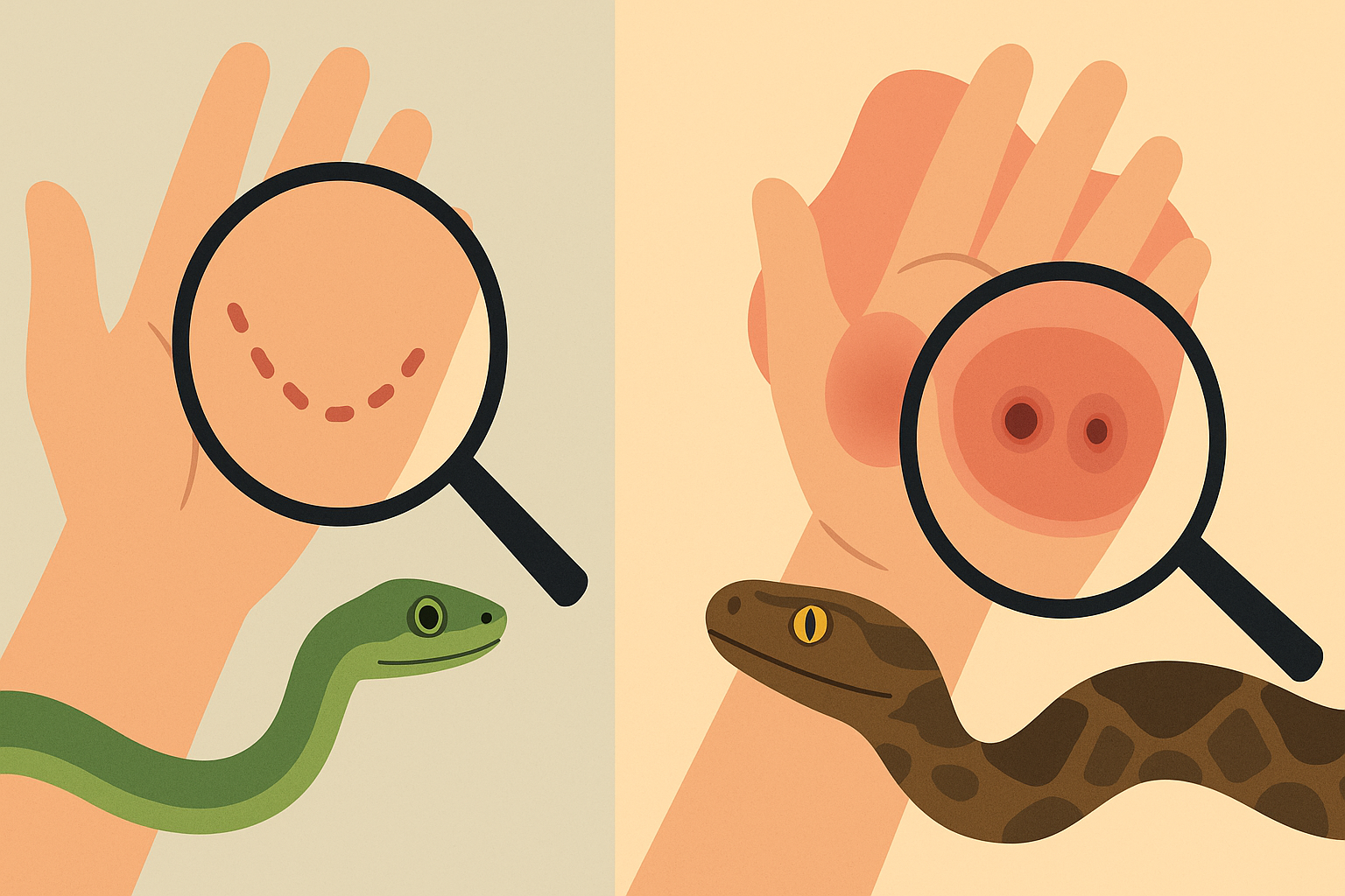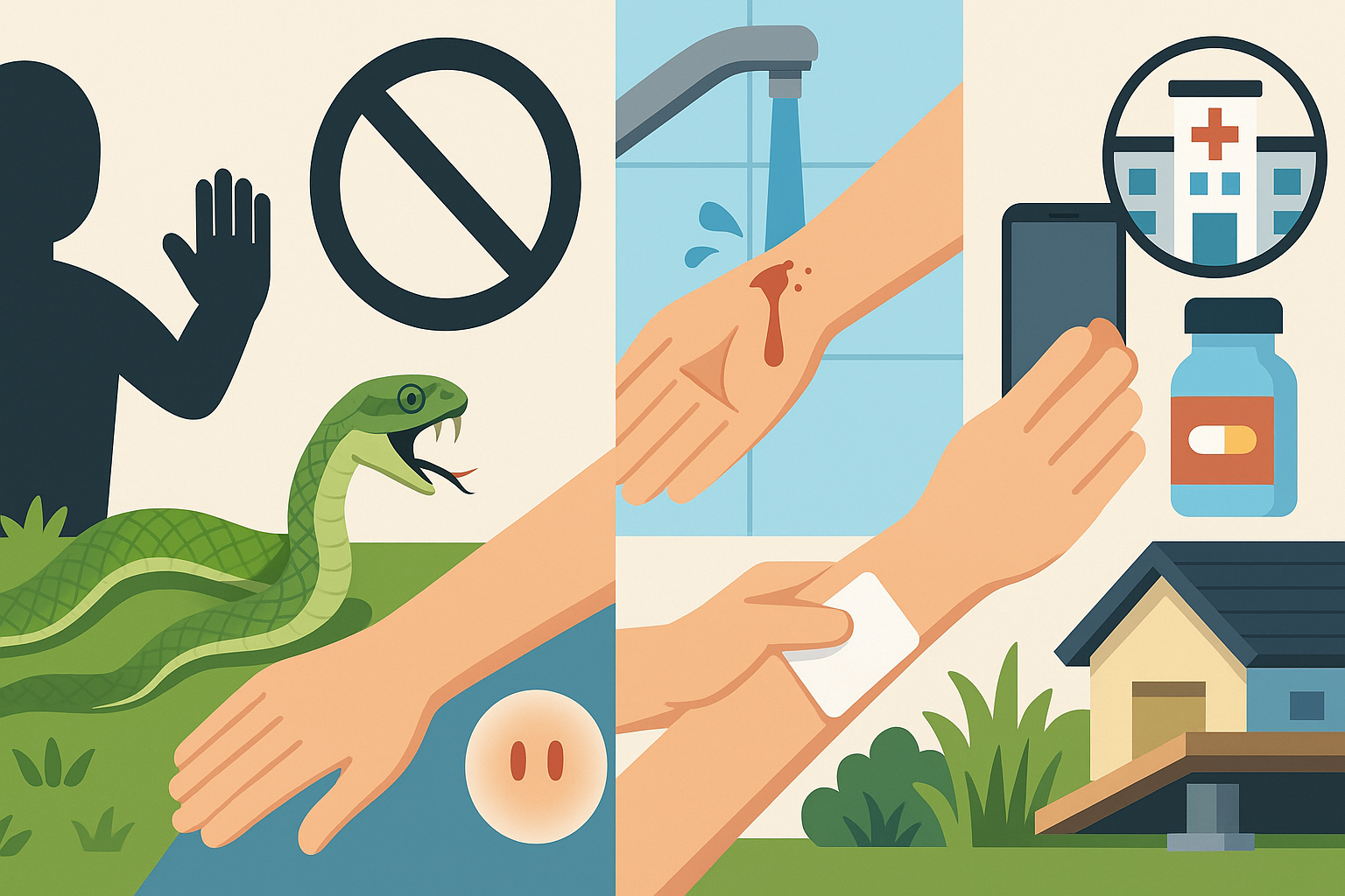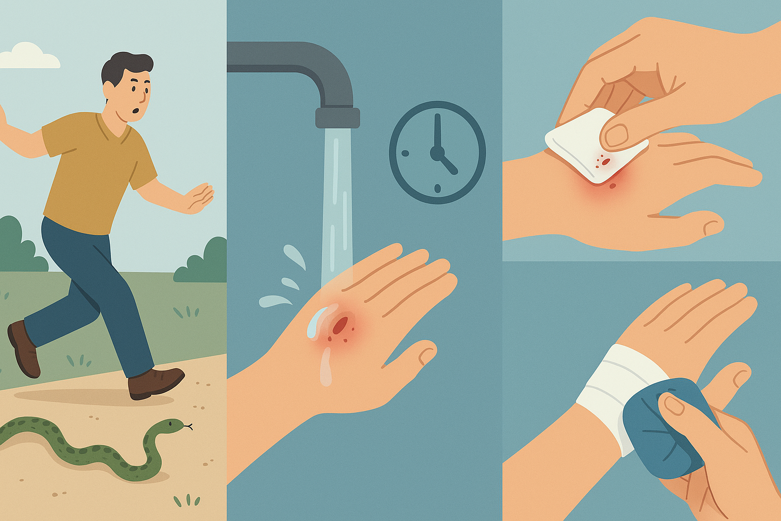 無毒でも咬傷は「創傷」です。ここでは噛み跡の特徴、痛みと出血の見通し、応急処置の手順、受診の目安、遭遇時の防御行動への理解をまとめ、数分で実行できる安全対処を示します。
