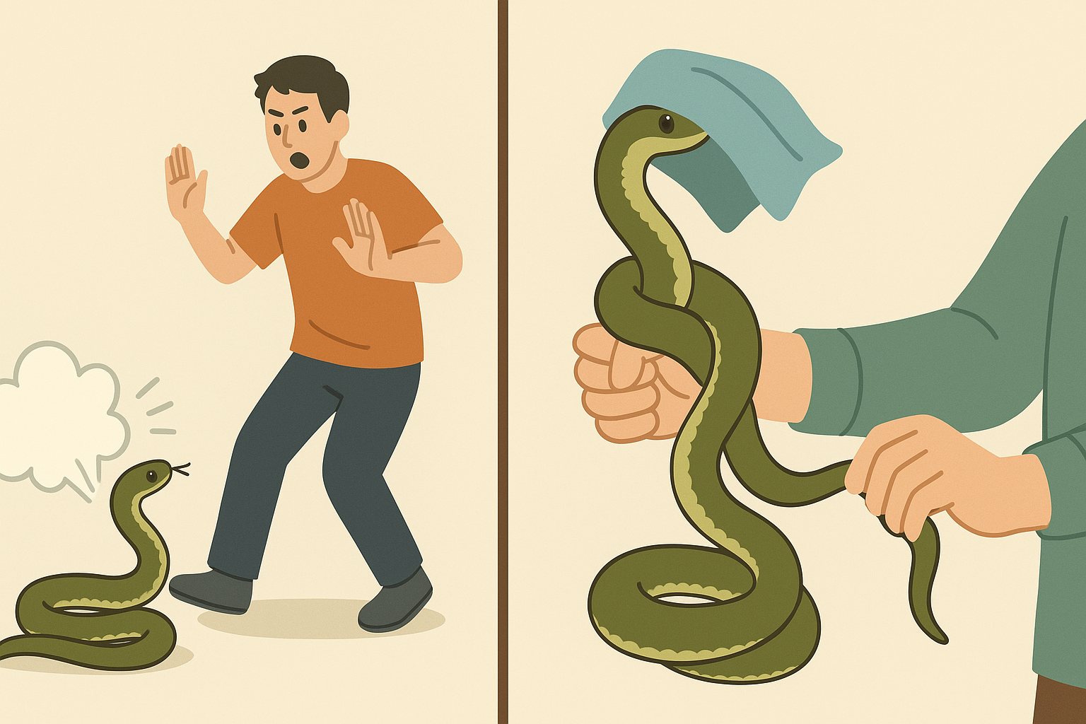 まずは距離を取る。大人でも反射的に手を伸ばしがちですが、捕まえない・踏みつけない・追わないが原則です。