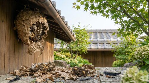 また、蜂にとっては雨風を避けられ、外敵から見つかりにくい場所が巣作りに向いています。軒下、戸袋、換気フード、屋根裏への隙間、物置の内部、庭木の茂みの奥などは、巣が大きくなるまで気づきにくい場所です。これらの場所は、人間が日常的に近づく場所でもあるため、鳥に壊された後に生活動線と蜂の活動範囲が重なりやすくなります。