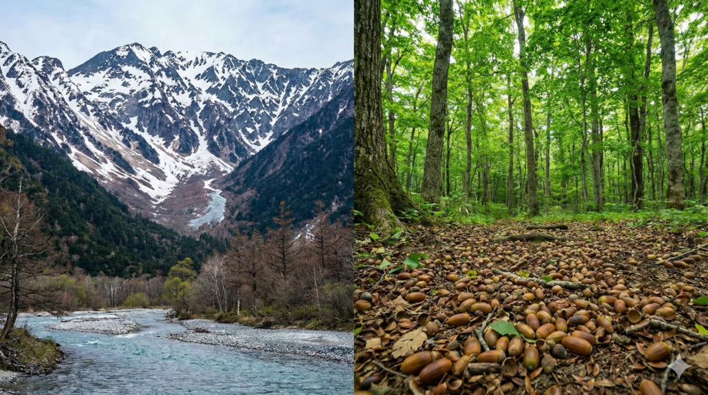 | 主な食性 | 魚、シカ、農作物、木の実など非常に多様 | ドングリ、ブナの実、山菜など植物が中心 |