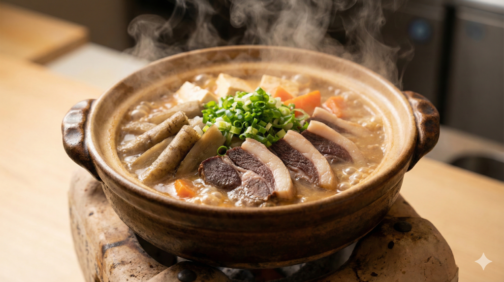- 材料:バラ肉や脂の多い部位、ゴボウ、大根、ニンジン、長ネギ、こんにゃく、豆腐など