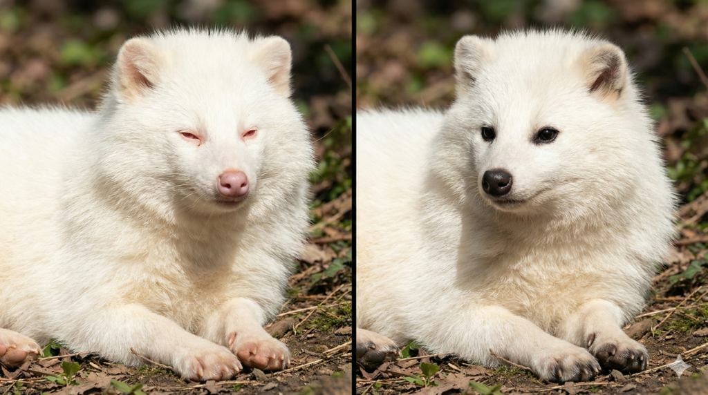 見た目だけで断定しないのも大事です。写真の色味は加工や照明で変わりますし、幼獣は毛が柔らかく薄色に見えることもあります。「白いっぽい」=即アルビノ、とは限りません。