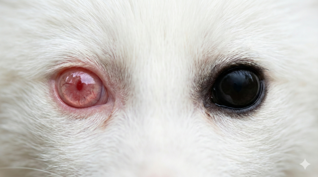 アルビノは、体内でメラニン色素を作る仕組みに問題が起き、毛だけでなく皮膚や目にも影響が出やすいタイプです。