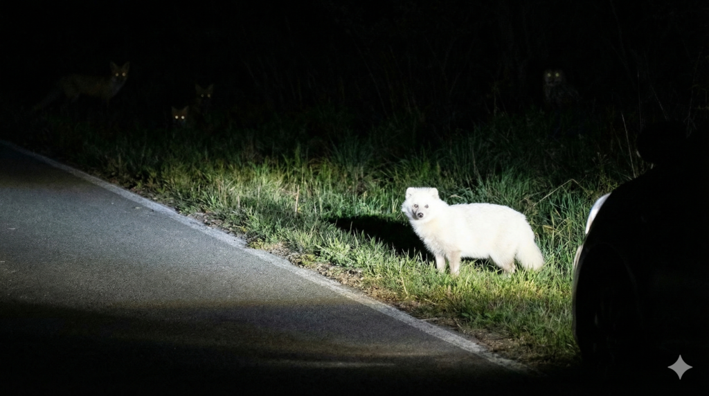 普通色なら影や地面に紛れますが、白い個体はライトに浮かび上がりやすいです。