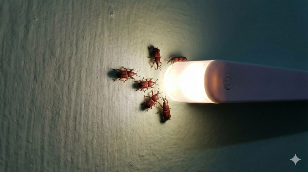 簡単な切り分け:夜に照明周りで見つかる → 光に寄っている可能性が高い/昼も穀物保管場所で虫や粉が見える → 発生源が近い可能性が高い