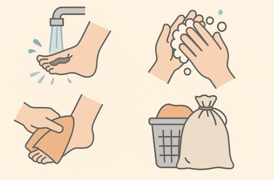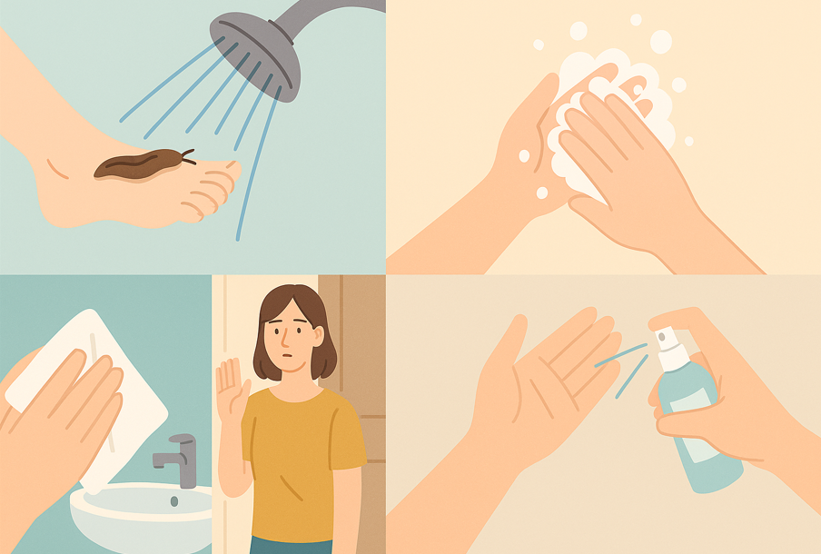 まずシャワーで手・腕・足など周辺ごと30秒以上洗い流し、その後に石けんを用いて手指の間や爪周り、足裏のしわまで丁寧に洗います。