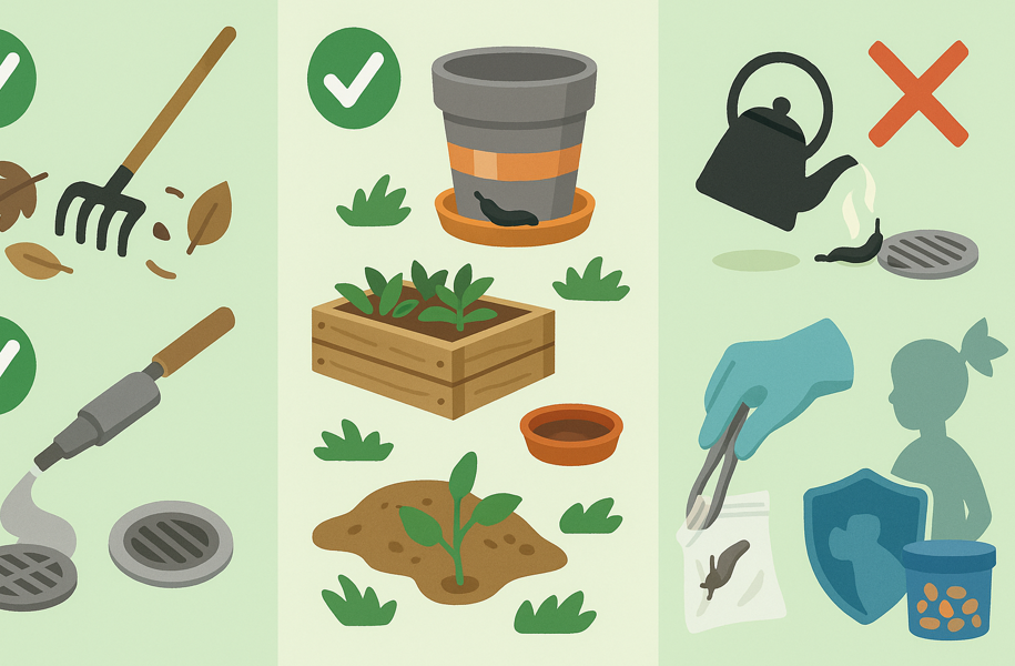 - 熱湯や重曹など物理的手段は周囲の安全に配慮