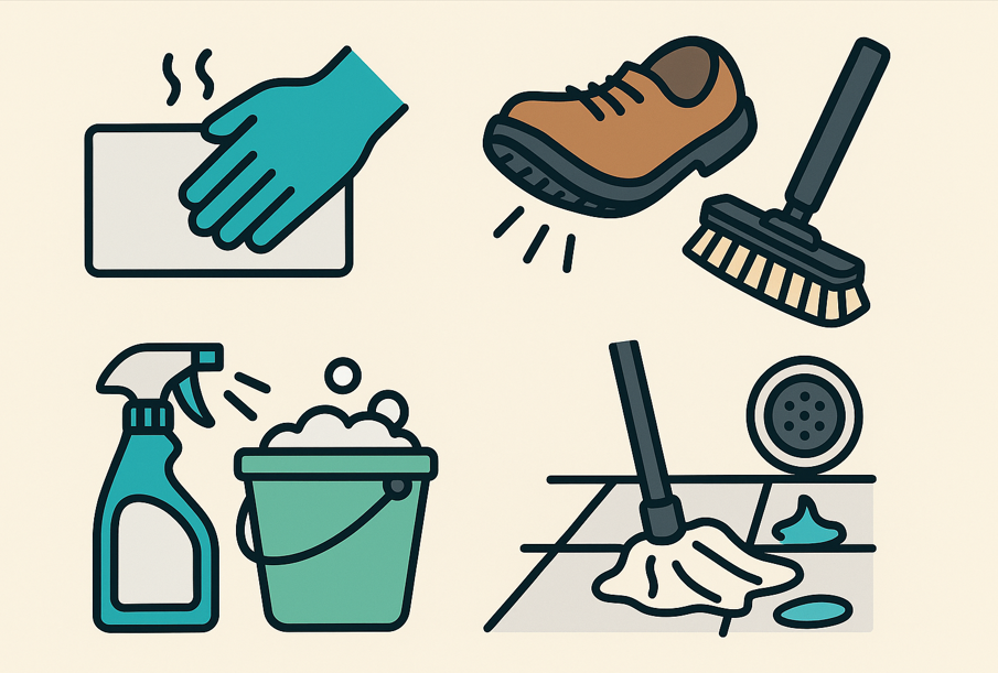 排水口やちりとりなどの用具も同様に洗浄し、最後に手洗いを忘れないことが肝心です。