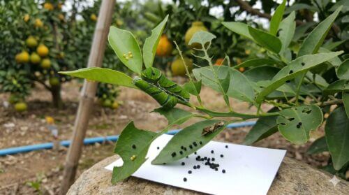 葉の数が少ない時期に数匹の幼虫に食い荒らされると、光合成ができなくなり、その後の成長が著しく遅れてしまいます。終齢幼虫になると数日で枝一本分の葉を完食することもあるため、こまめな見回りと捕殺が基本の対策となります。