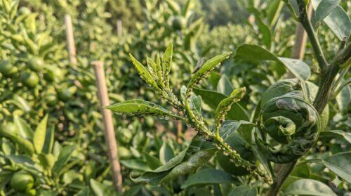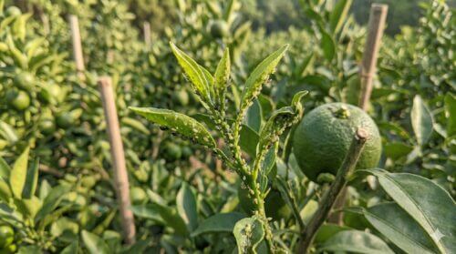 春、デコポンの新芽が芽吹く3月から4月にかけて、真っ先に現れるのがアブラムシです。新梢の先端にびっしりと群生し、若い葉から養分を吸い取ります。被害を受けた新葉は縮れて展開できなくなり、成長が止まってしまいます。アブラムシは増殖スピードが非常に速いため、見つけたらすぐに駆除しなければなりません。