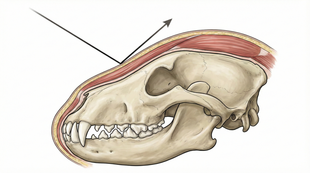 咬筋は、堅い木の実や肉を噛み砕くための「エンジン」のような筋肉で、人間とは比較にならない厚みがあります。