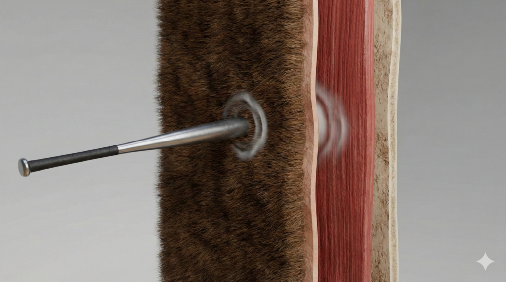 人間であれば、数十ジュール程度の打撃でも頭蓋骨の骨折が起こり得るとされていますが、ツキノワグマのように厚い骨と筋肉に守られた頭部では、その数倍〜数十倍のエネルギーがなければ即座の失神や行動不能にはつながりにくいと考えた方が安全です。