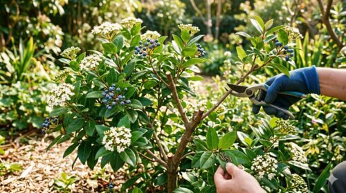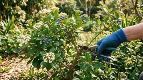 注意していただきたいのは、ビバーナム・ティヌスは夏以降に翌春の花芽を準備し始めるという点です。秋以降にバッサリと切り戻してしまうと、せっかくの花芽をすべて落としてしまい、来年の花が見られなくなります。形を整えるための軽い剪定は問題ありませんが、構造を変えるような大きな剪定は必ず「花後すぐ」に行うよう徹底してください。適切な剪定は、害虫予防だけでなく、花の密度を高め、宝石のような実をたくさん実らせるための必須作業です。