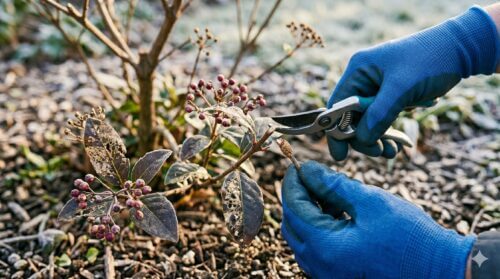 1月から2月の厳冬期、ビバーナム・ティヌスが休眠している間に枝先をじっくり観察してください。正常な枝は滑らかですが、卵が産み付けられた場所は、小さなブツブツとした突起が並んでいたり、不自然に色が濃くなっていたりします。これらの枝先を5〜10cmほど剪定し、ビニール袋に入れて密封して処分してください。冬のメンテナンスが春の美しさを決めると言っても過言ではありません。この作業を行うだけで、翌春に孵化する幼虫の数を8割以上減らすことが可能です。
