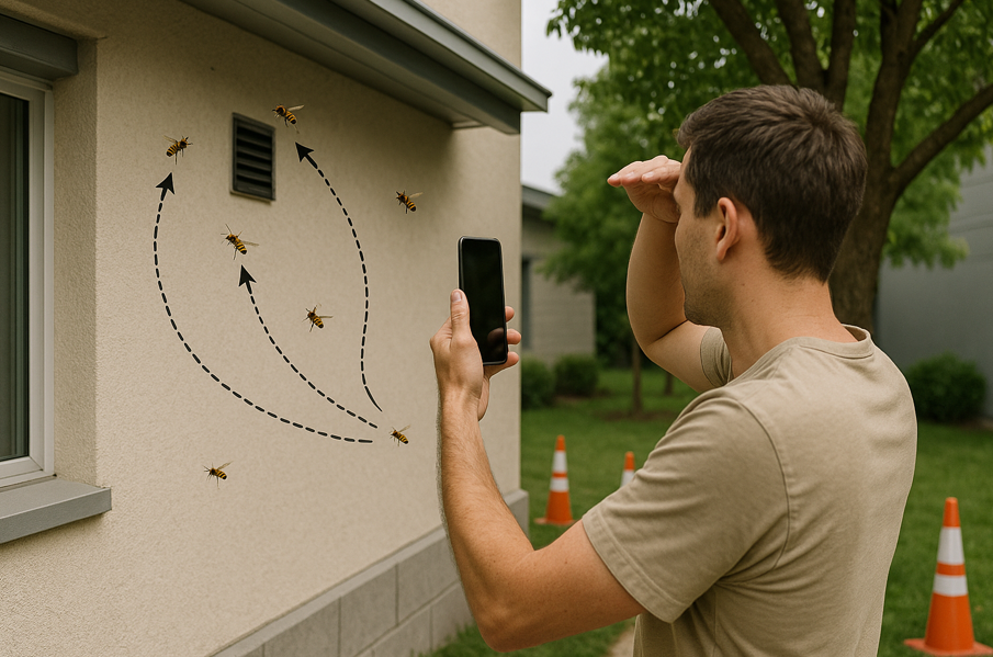 まずは半径5〜10メートルの範囲を静かに見回し、同種の蜂の往来、出入りしている隙間や孔、樹木や軒裏の陰を確認します。