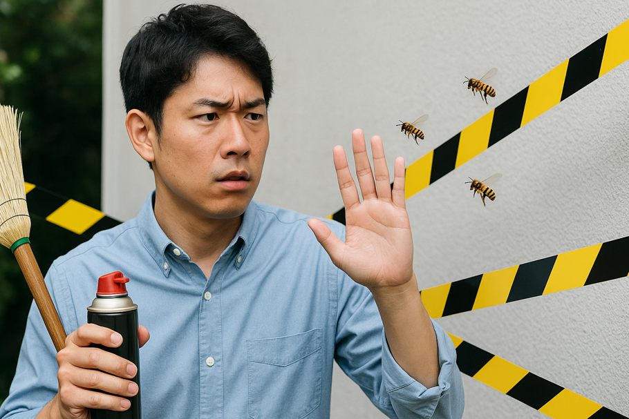 追い払おうとして叩く、ほうきで払う、ジェットスプレーを過剰噴射する行為は、蜂を強く刺激して防御行動を誘発します。