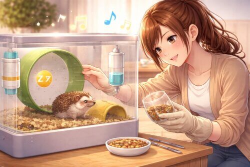 うるさい問題は、気合いではなく設備で解決した方が早いです。静音性の高い回し車への交換、ケージ下への防振マット、台との接触面の見直し、寝室からの移動。これらはどれも地味ですが、睡眠の質を守る効果が大きいです。音が気になる時は、まずハリネズミ本人ではなく、音がどこで増幅されているかを疑ってください。回し車の軸、ケージの金属部分、置き台、床との接触面。音源と増幅点が別々に存在することはよくあります。