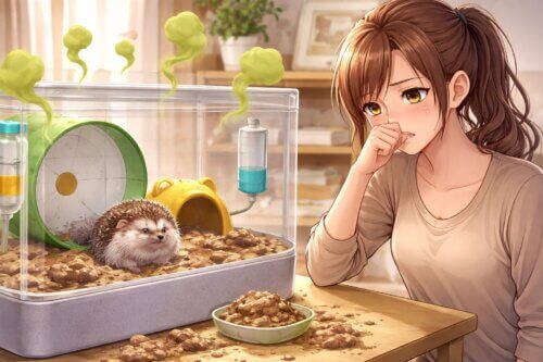 ハリネズミそのものの体臭が極端に強いとは限りませんが、排泄物、床材、回し車の汚れ、食べ残しが重なると、飼育スペース全体のにおいはかなり気になります。においのストレスは目に見えないぶん蓄積しやすく、掃除のたびに嫌気が差す原因になります。とくに夜間に排泄して回し車で踏み広げる個体では、朝になった時の臭気が強くなりやすく、見た目の汚れ以上に精神的な負担が大きくなります。
