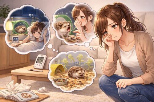 特にワンルームや寝室と同じ空間で飼っている場合は、うるさいという悩みが生活全体に広がります。夜中に何度も目が覚める、朝起きても疲れが残る、仕事や家事に集中しづらい。そうなると、昼間に寝ているハリネズミを見るだけで複雑な気持ちになってしまうこともあります。私はこの状態を、飼い主の忍耐不足だとは考えません。睡眠が削られると、どんな相手にも優しくし続けるのは難しいからです。