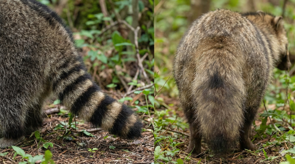 遠目で同じくらいに見えても、近づくとアライグマの胴が分厚く、前肢も“力が入りそう”な印象のことが多いです。