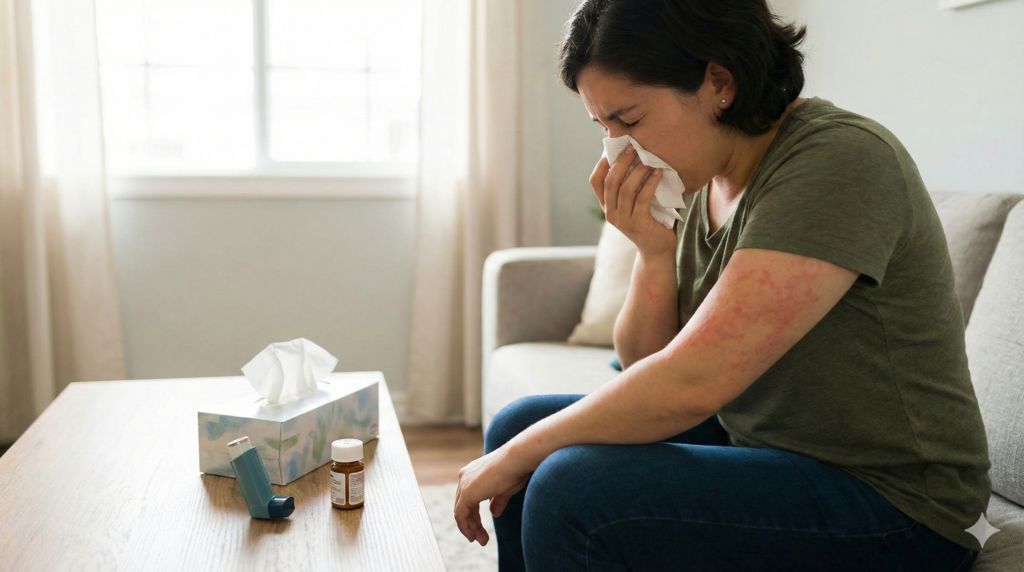 アレルギー症状は、皮膚(じんましん、かゆみ)だけでなく、鼻(鼻水、くしゃみ)、気道(咳、息苦しさ)、消化器(吐き気、腹痛)など多様です。