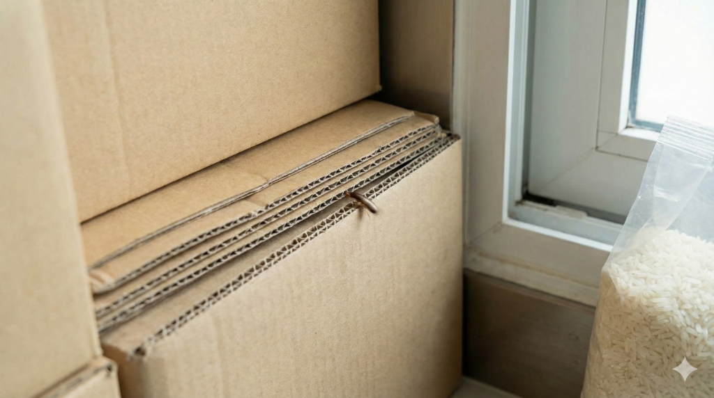 米びつ内だけでなく、シンク下・冷蔵庫裏・段ボール周辺に同時発生しているときは、家のどこかに“湿気スポット”が残っています。虫は結果で、原因は環境です。とくに段ボールは吸湿してカビやすく、隙間だらけで隠れ家にもなります。