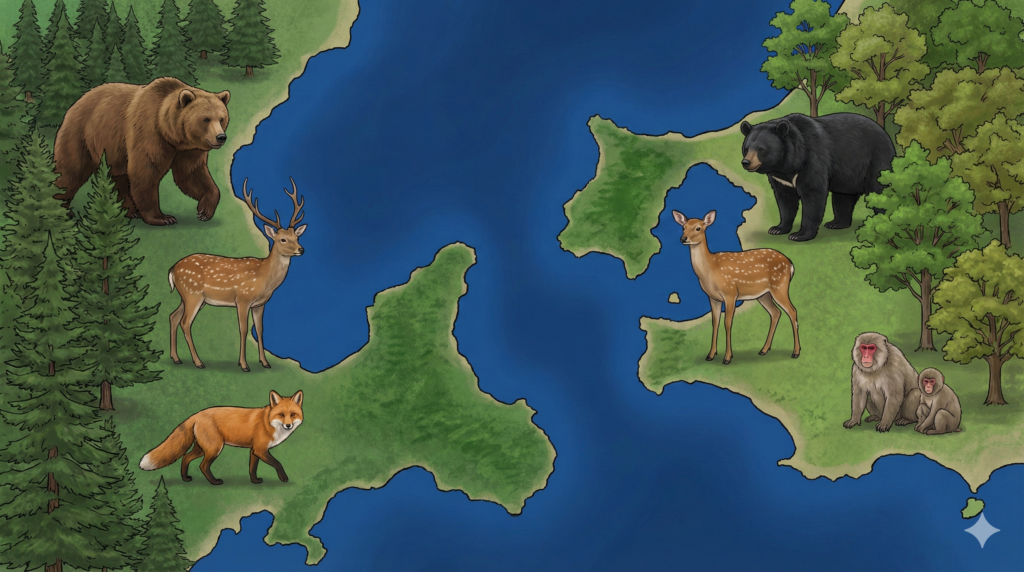 北海道側にはヒグマやエゾシカ、キタキツネといった北方系の動物が、本州側にはツキノワグマやニホンジカ、ニホンザルなどが中心となる動物相が形成されているのは、その象徴的な例です。